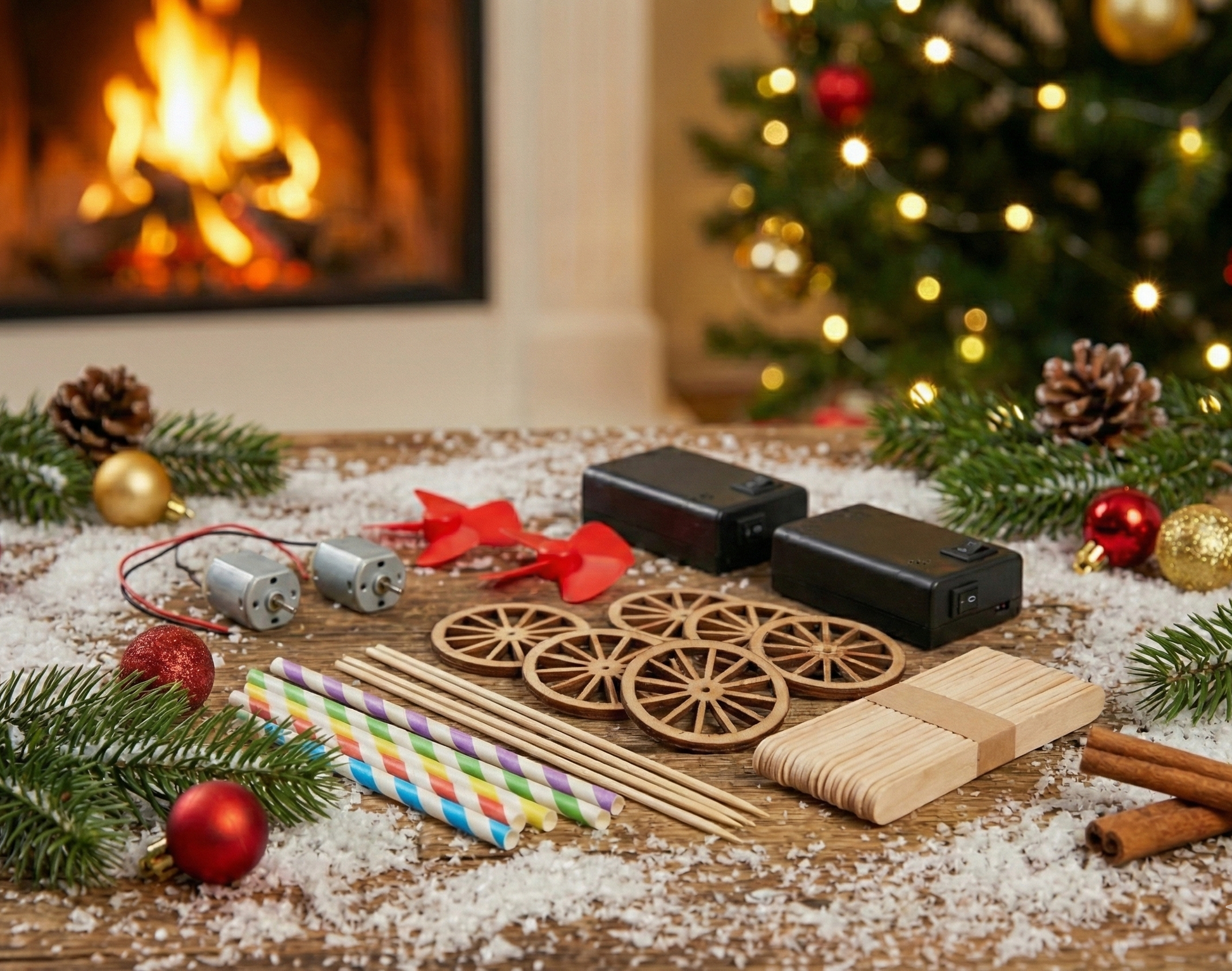 Du får alle materialer du skal bruge til at bygge 2 propelbiler, det eneste du skal have hjemmefra er en saks, batterier og en limpistol - har du ikke batterier eller en limpistol kan du tilkøbe den her på siden.